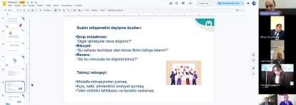 Təlimçi həmkarlarla keçirilən növbəti onlayn görüş “Auditoriyadan gələn sualların idarə olunması” mövzusuna həsr olunub. Görüşün əsas məqsədi təlim və təqdimatlar zamanı iştirakçılar tərəfindən verilən müxtəlif tip sualların düzgün şəkildə tanınması və effektiv idarə olunması bacarıqlarının inkişaf etdirilməsi olub.